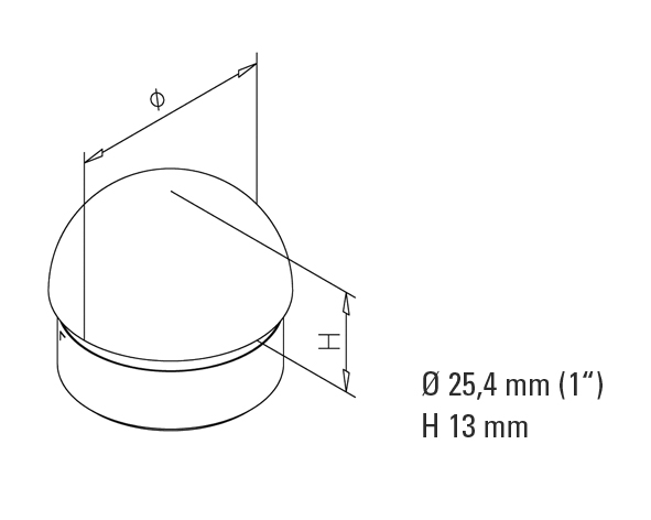 Halvkugleformet endeprop til rør Ø 25,4 mm. Fremstillet i stål med messing-look overflade. Bruges til dekorativ afslutning af rør i interiør-, inventar- og gelænderløsninger.