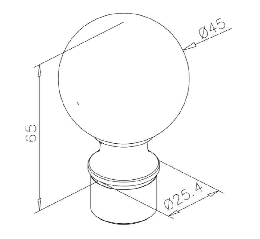 Kugleformet endeprop til rundrør Ø 25,4 mm. Fremstillet i stål med messing-look overflade. Anvendes til dekorativ og funktionel afslutning af rør i indretnings-, inventar- og gelænderløsninger.