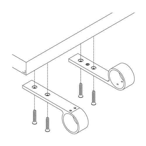 Fodhviler bordbeslag til Ø38,1 mm rør i messing-look. Beslaget monteres på undersiden af en bardisk eller bordplade og giver en stabil fastgørelse af fodhvilerrøret tæt under forkanten. Det anvendes i bar- og restaurantmiljøer, hvor røret skal følge bordets linje og være sikkert understøttet. Beslaget skrues fast i pladens underside, og røret føres ind i holderen.