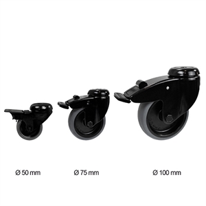 Et kompakt og stærkt hjul, godt til stativer, borde og andre konstruktioner hvor du skal kunne flytte ting nemt rundt – og samtidig have mulighed for at låse dem fast.